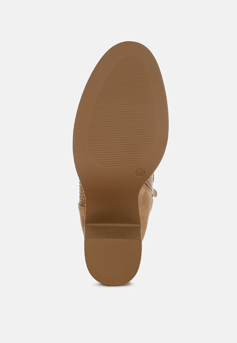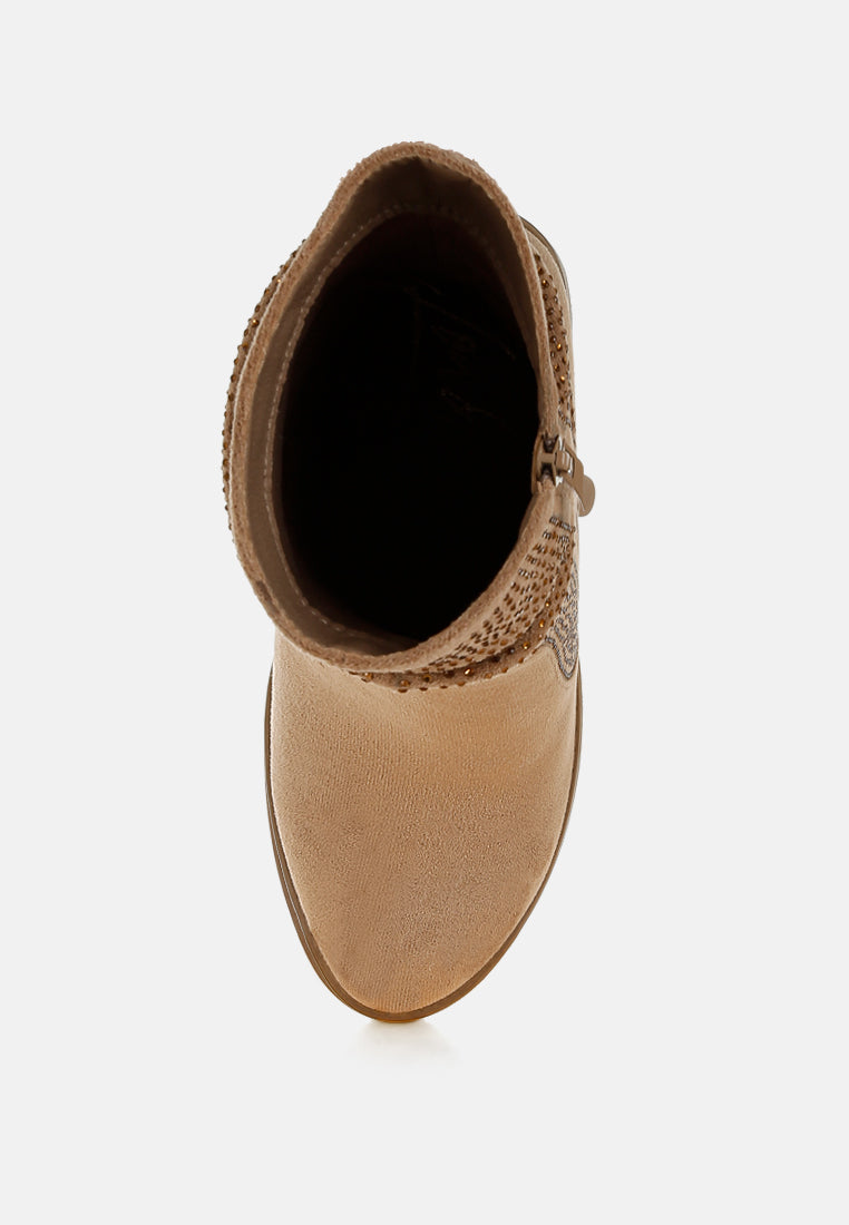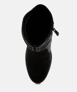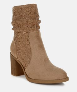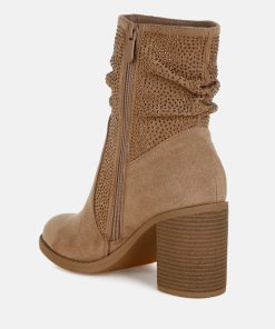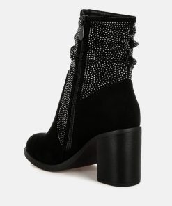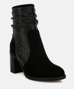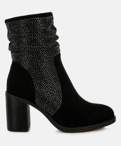 The uber-chic, microfiber ankle boots are a classic with a trendy yet comfortable block heel and a minimal side zipper closure. With exquisite rhinestone embellishments and a slouchy design, these stunners are designed to complement every outfit you own!