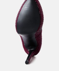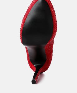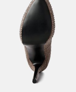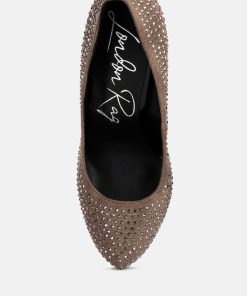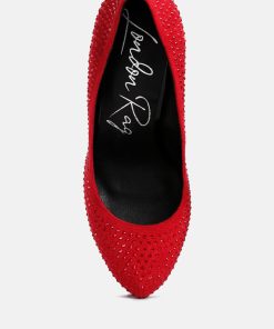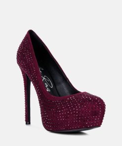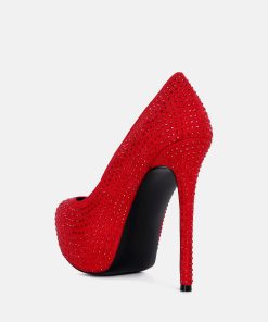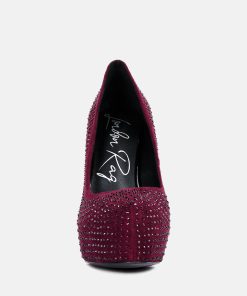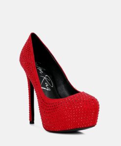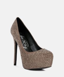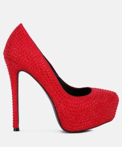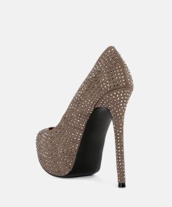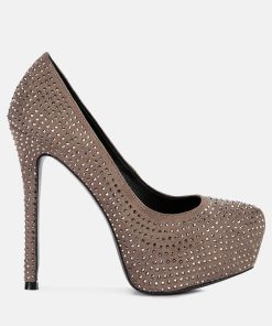 High Heeled Dress Sandal with diamante heat set in microfiber. The stiletto pumps with the raised platform are a stylish pick. The heat set diamante detail looks gorgeous on feet.