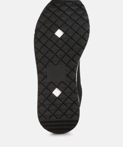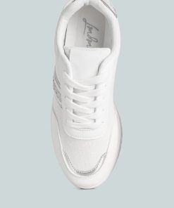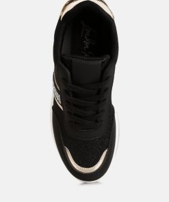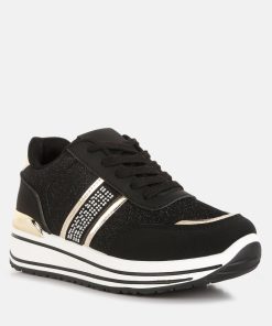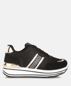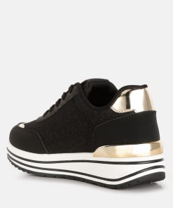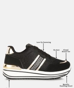 Fly knit sneakers featuring metallic paneling detail and platform soles exude a unique blend of style and comfort. The breathable knit material complements the eye-catching metallic elements, creating a contemporary aesthetic.