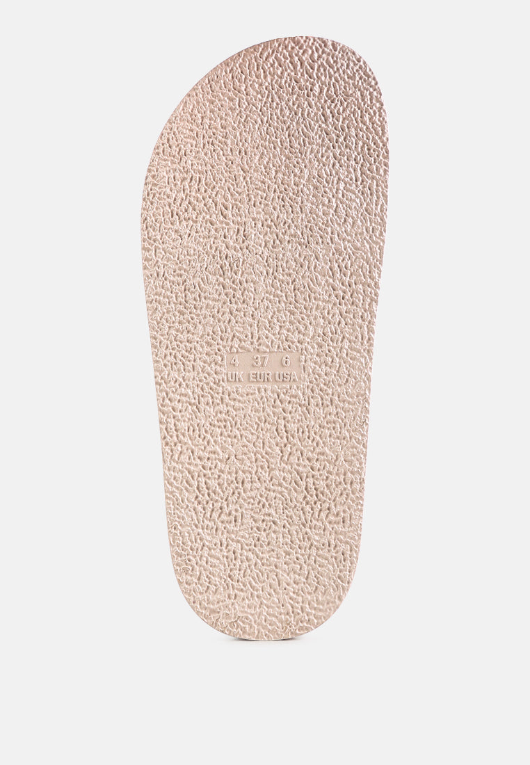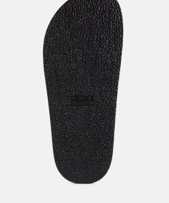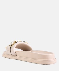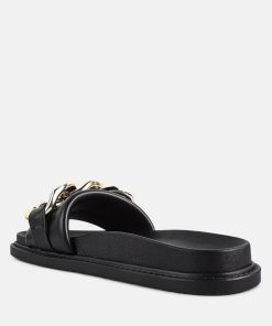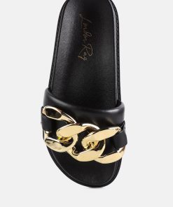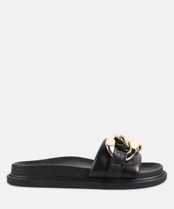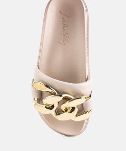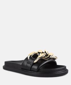 Cushioned straps slide featuring chunky Cuban chain. These slides feature molded footbed. A perfect slide for those breezy walks.
