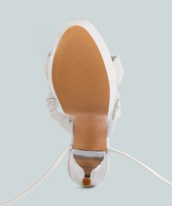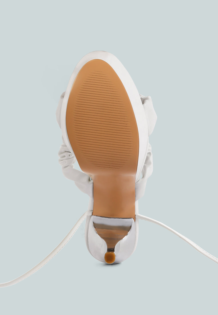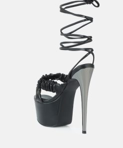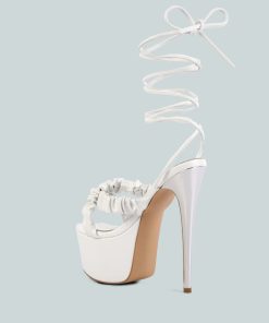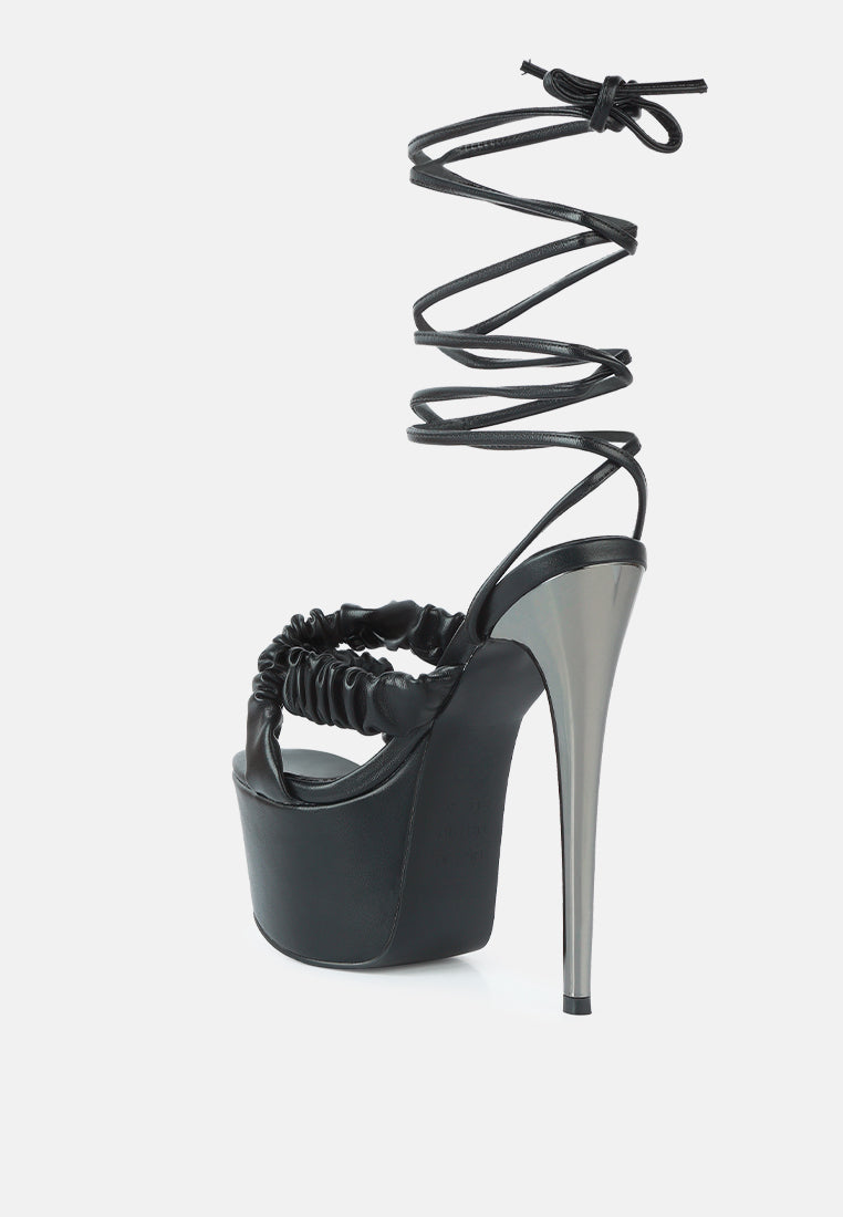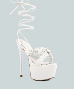 Scrunchie strapped ultra high heeled sandals in faux leather – the stylish and trendy syle has tie up design and is built on high platform which gives it extra height. Fire up your style and social media with these on your feet!