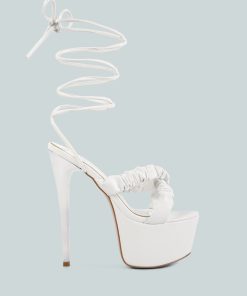 Scrunchie strapped ultra high heeled sandals in faux leather – the stylish and trendy syle has tie up design and is built on high platform which gives it extra height. Fire up your style and social media with these on your feet!