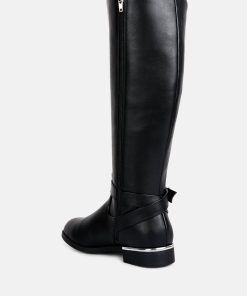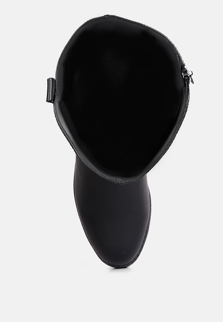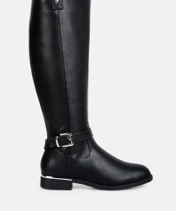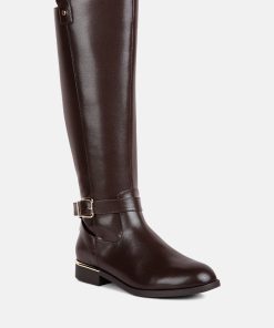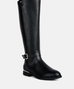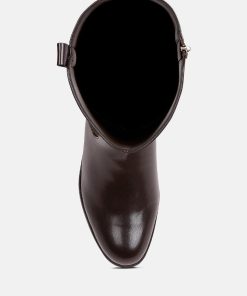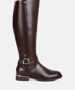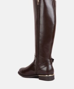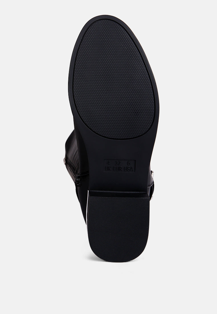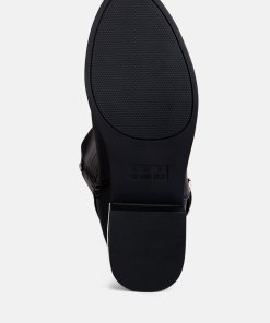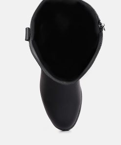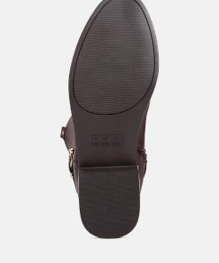 The buckle-embellished boots are edgy and chic with an accentuating gold sling detail on the heel, accentuating the heeled boots’ aesthetics. The boots are sure to make a bold statement and are comfortable to wear with soft padded insoles.
