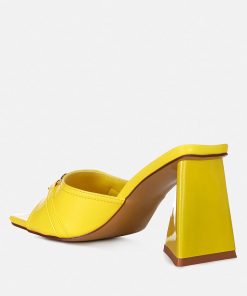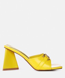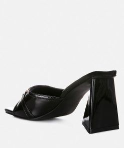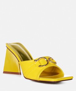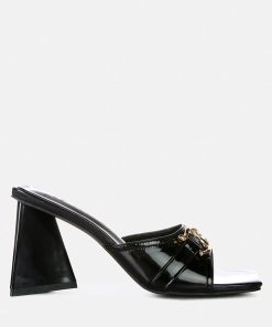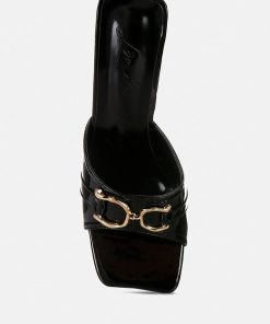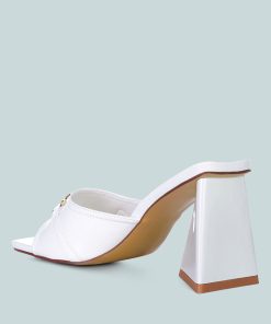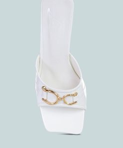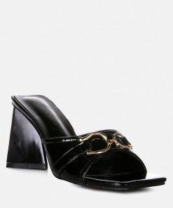 The slip-on triangular block heel sandals ooze sexiness and scream style while staying incredibly easy to wear. What catches the eye is the horse-bit buckle detail adorning the front, adding the right amount of drama. Wear these beauties on bright sunny days or with evening dresses for a party.