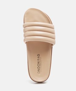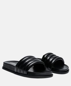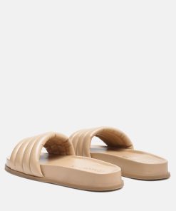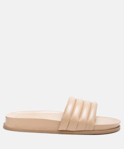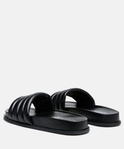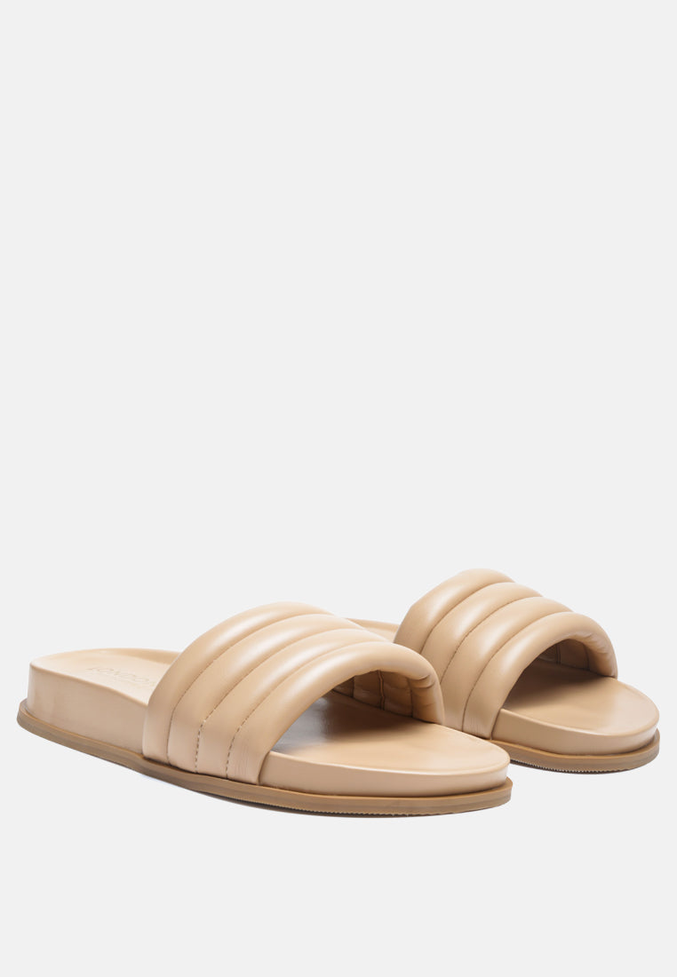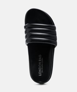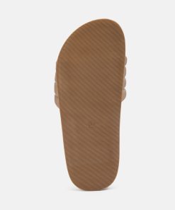 Quilted Strap Pool slides which offer great wear across surfaces, can be worn indoors and outdoors alike. The round-toe flats are all-day comfy pairs.