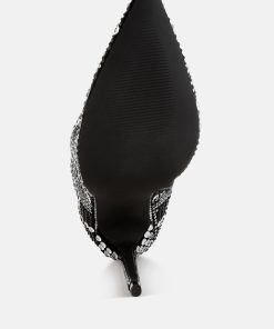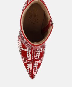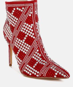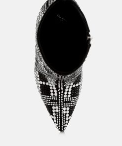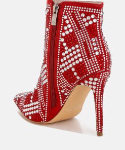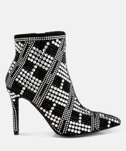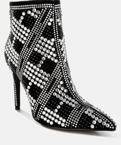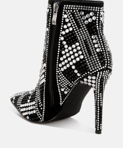 Opulent, indulgent, comfortable—meet your new ankle-length stiletto boots. They have a soft microfiber upper and patterned rhinestone embellishment. With a side zipper fastening and 4-inch rhinestone-studded stiletto heel, these party boots are one pair that will soon turn into your price possession.